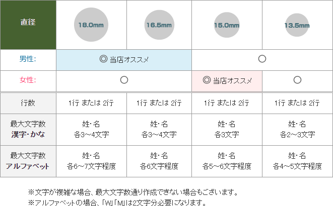 実印は8~25mmの範囲内であれば印鑑登録が可能ですが、重要な取引きなどに使うことが多いため、どっしりとした重厚感のあるサイズが好まれます。捺しやすさも重要になるため、手の大きな方は大きめ、手の小さな方は小ぶりなサイズがオススメです。また、文字数や画数が多い場合は大きめにすると見栄えが良くなります。